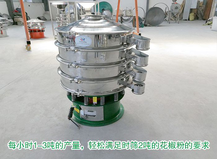 1500mm振動篩可以篩分0.028mm顆粒或粉末狀物料,篩分精度高。所以對于60目左右的花椒粉可以輕松進行篩分,同時1500mm振動篩還配備有彈跳球,在花椒粉篩分過程中不停撞擊篩網,達到清網的目的,網孔不會堵塞,篩分效率高。
