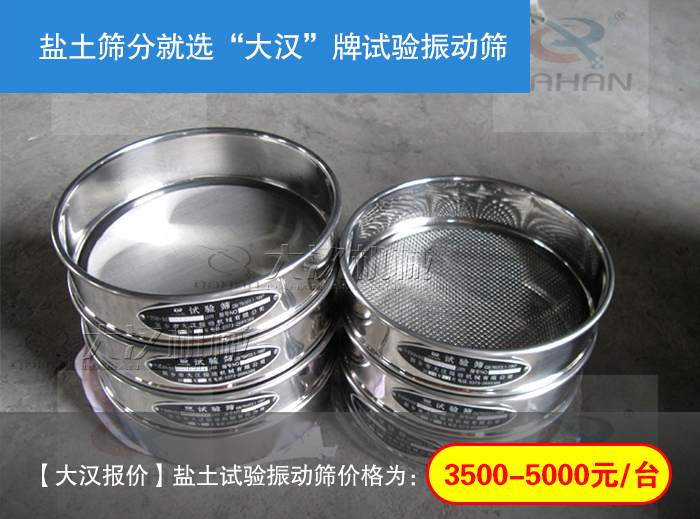 大漢機械生產的鹽土試驗振動篩可分為試驗篩機和試驗篩框,單臺試驗振動篩機的價格為:3500元,一臺篩機配7個篩框,直徑有200mm、300mm兩種型號,網目多種,具體網目可根據用戶需求定制,篩框的價格在100-300元/個,這兩種產品可以分開購買,所以這也是影響試驗篩價格的因素。