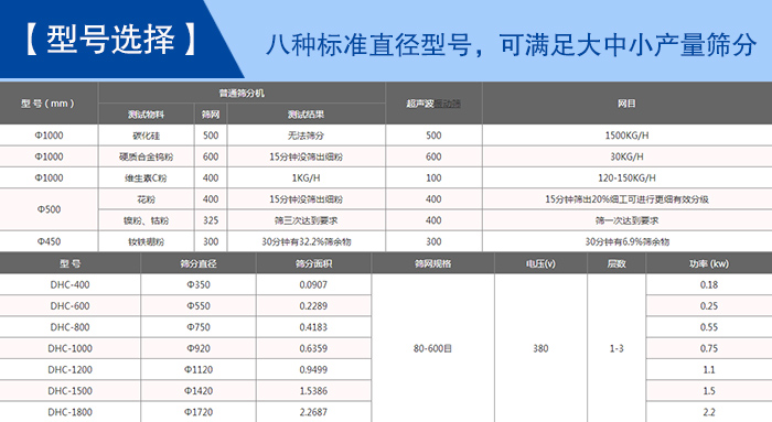 【型號選擇】—— DHC系列超聲波振動篩型號有:DHC-400、DHC-600、DHC-800、DHC-1000、DHC-1200、DHC-1500、DHC-1800、DHC-2000等八種標準直徑型號,可滿足100目—600目的細網篩分,每小時500KG—3000KG的大中小產量篩分。