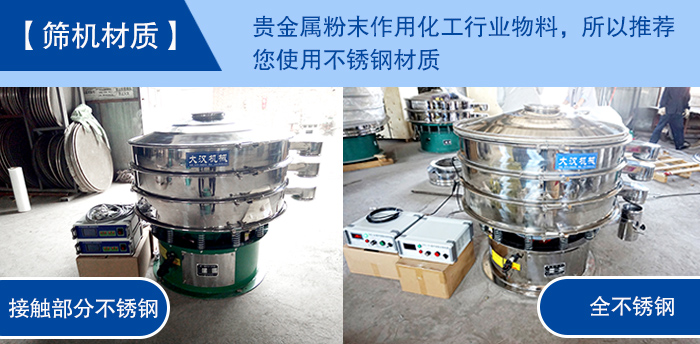 【篩機材質】—— 貴金屬粉末作用化工行業物料,所以推薦您使用不銹鋼材質,而常用的不銹鋼超聲波振動篩分為兩種結構,一種是整機均采用不銹鋼制成,另一種是與物料接觸不分為不銹鋼材質,底座為碳鋼材質,至于如何選擇就看您對衛生環境的要求以及成本預算了。