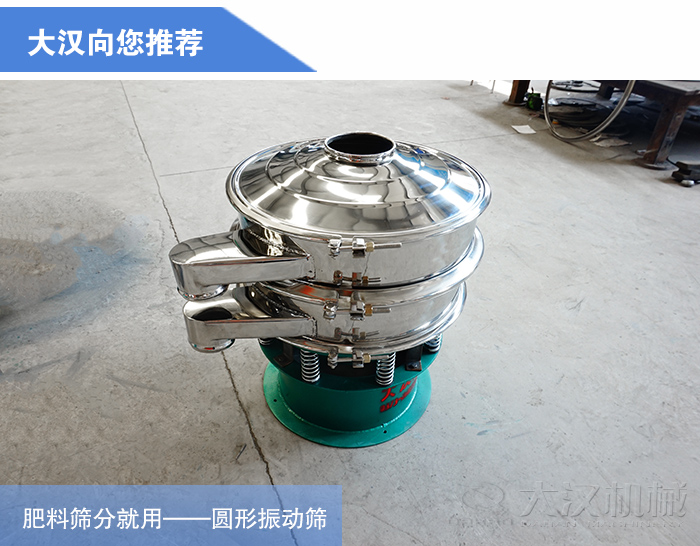 肥料也叫做化學肥料,顆粒大小一般在0.05-0.5mm之間,它是用化學方法制成的農作物生長需要的營養元素的肥料。也稱無機肥料,包括氮肥、磷肥、鉀肥、微肥、復合肥料等。根據肥料的物料特性,大漢小編推薦您使用圓形振動篩對其進行篩分工作,下面小編從型號、材質、價格等三方面給大家介紹一下肥料篩分所用到的圓形振動篩。