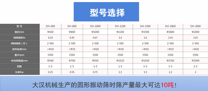 大漢機械生產的圓形振動篩時篩產量可達10噸!型號有:DH-400mm、DH-600mm、DH-800mm、DH-1000mm、DH-1200mm、DH-1500mm、DH-1800mm、DH-2000mm等八種標準型號。可滿足肥料每小時500KG—10T的大、中、小產量的篩分工作。