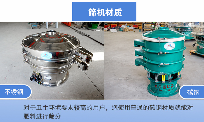 肥料篩分可用的圓形振動篩有兩種材質:碳鋼、不銹鋼;碳鋼材質的圓形振動篩熱處理和機械性能好,價格便宜,但是長時間的使用會發生腐蝕、生銹等問題,不適合用于對衛生行業要就較高的物料和企業;而不銹鋼材質耐酸耐堿、防腐防銹、衛生環保,廣泛用于化工、食品、醫藥等行業。所以如果不是對于衛生環境要求較高的用戶,您使用普通的碳鋼材質就能對肥料進行篩分。