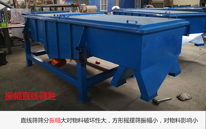 物料在直線篩的篩網上作直線跳躍運動,物料朝一個方向運動,振動幅度大,在跳躍和振動的兩者力下,物料很容易發生形態的變化,對物料的破壞性大;而方形搖擺篩也叫做平面回轉篩,機械通過搖擺使物料在篩網上循環做橢圓形軌跡運動,物料不需通過振動就可以達到篩分的目的。