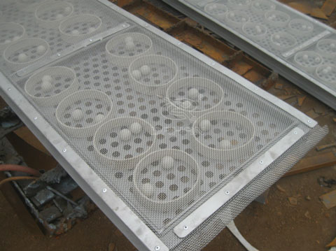 這種網(wǎng)架結(jié)構(gòu)的優(yōu)勢(shì)就是更換工作網(wǎng)比較快,工作網(wǎng)下的目網(wǎng)其骨架作用,支撐工作篩網(wǎng),保證篩面的平整度,防止物料沖擊壓塌工作網(wǎng),同時(shí)又防止篩板上的彈跳球撞擊工作網(wǎng),把工作網(wǎng)撞破,這種網(wǎng)架結(jié)構(gòu)的缺點(diǎn)就是母網(wǎng)與工作網(wǎng)重疊部分,影響篩分面積。